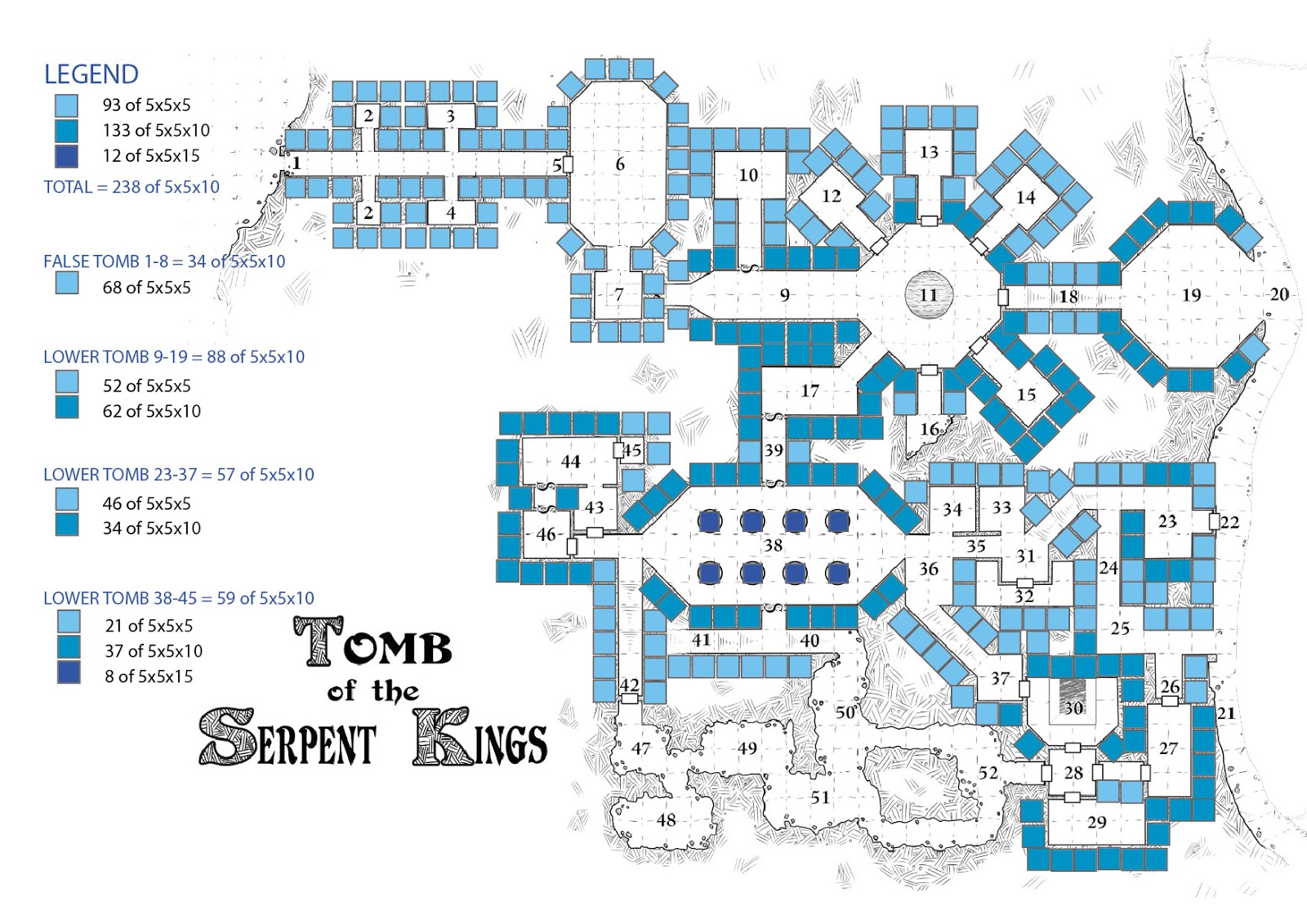 | As an example of dungeon quarrying, here is the Tomb of the Serpent Kings with ceiling heights of 5, 10 and 15 feet. I'm counting enough stone to furnish 238 blocks of 5x5x10 feet for new constructions. Map by Janon. |